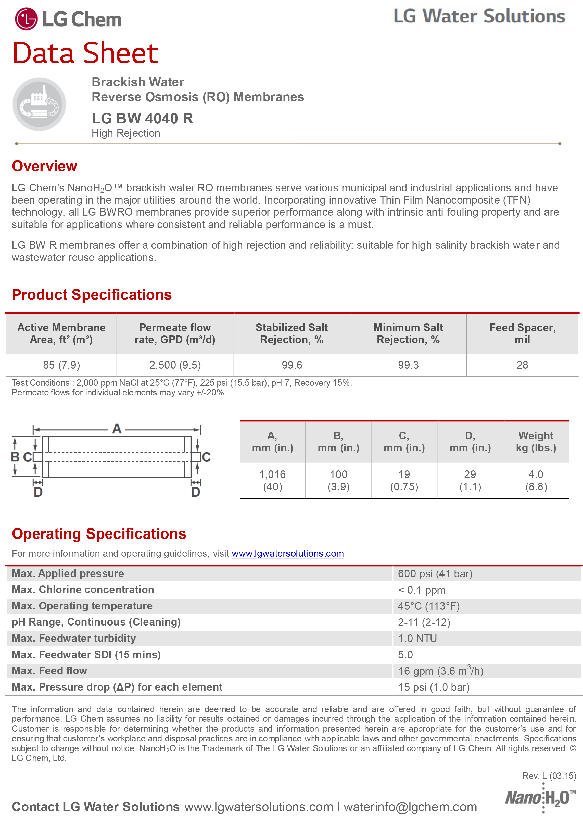 High Rejection |LG BW R membranes offer a combination of high rejection and reliability: suitable for high salinity brackish water and wastewater reuse applications.