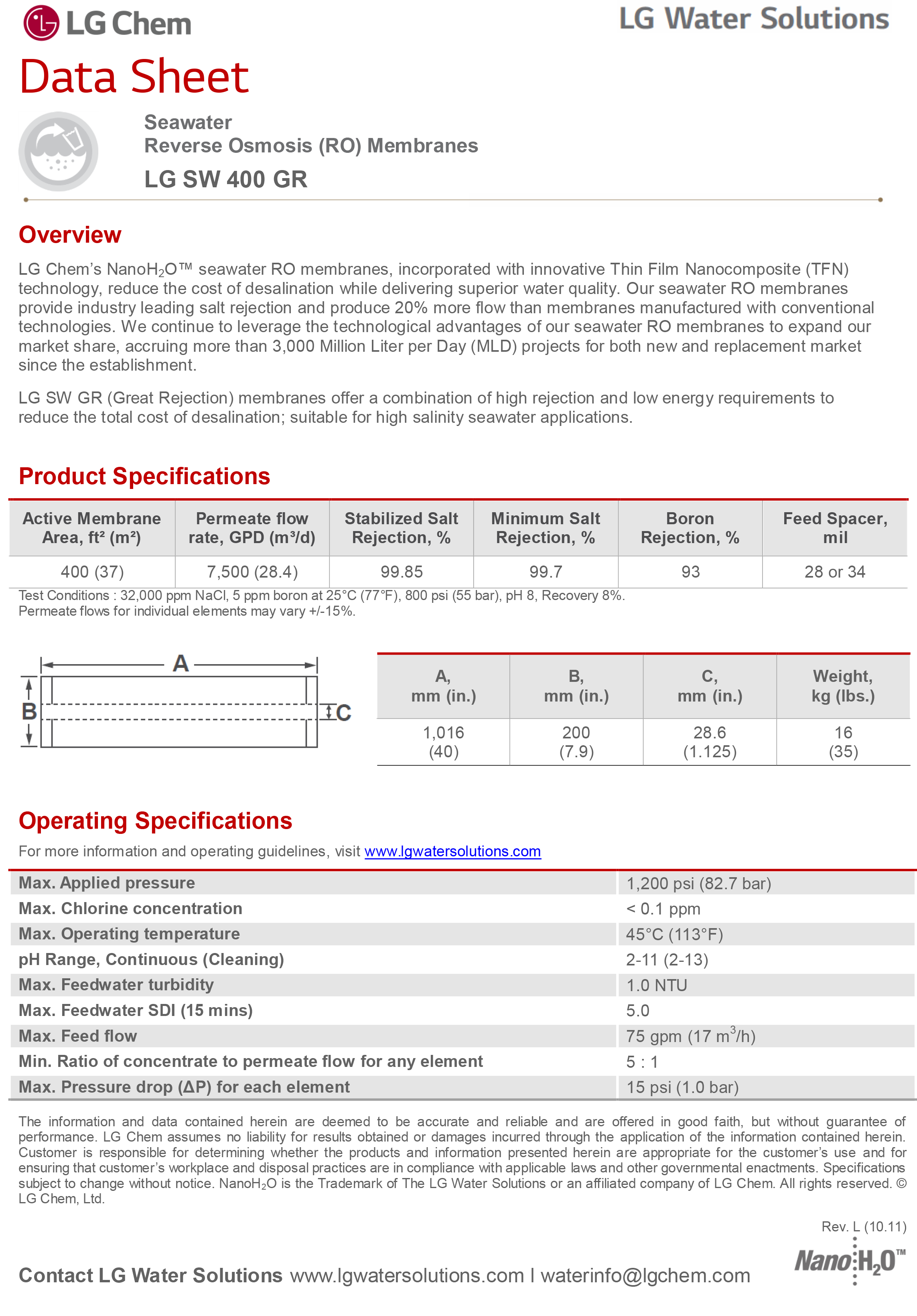 LG SW GR (Great Rejection) membranes offer a combination of high rejection and low energy requirements to reduce the total cost of desalination; suitable for high salinity seawater applications.