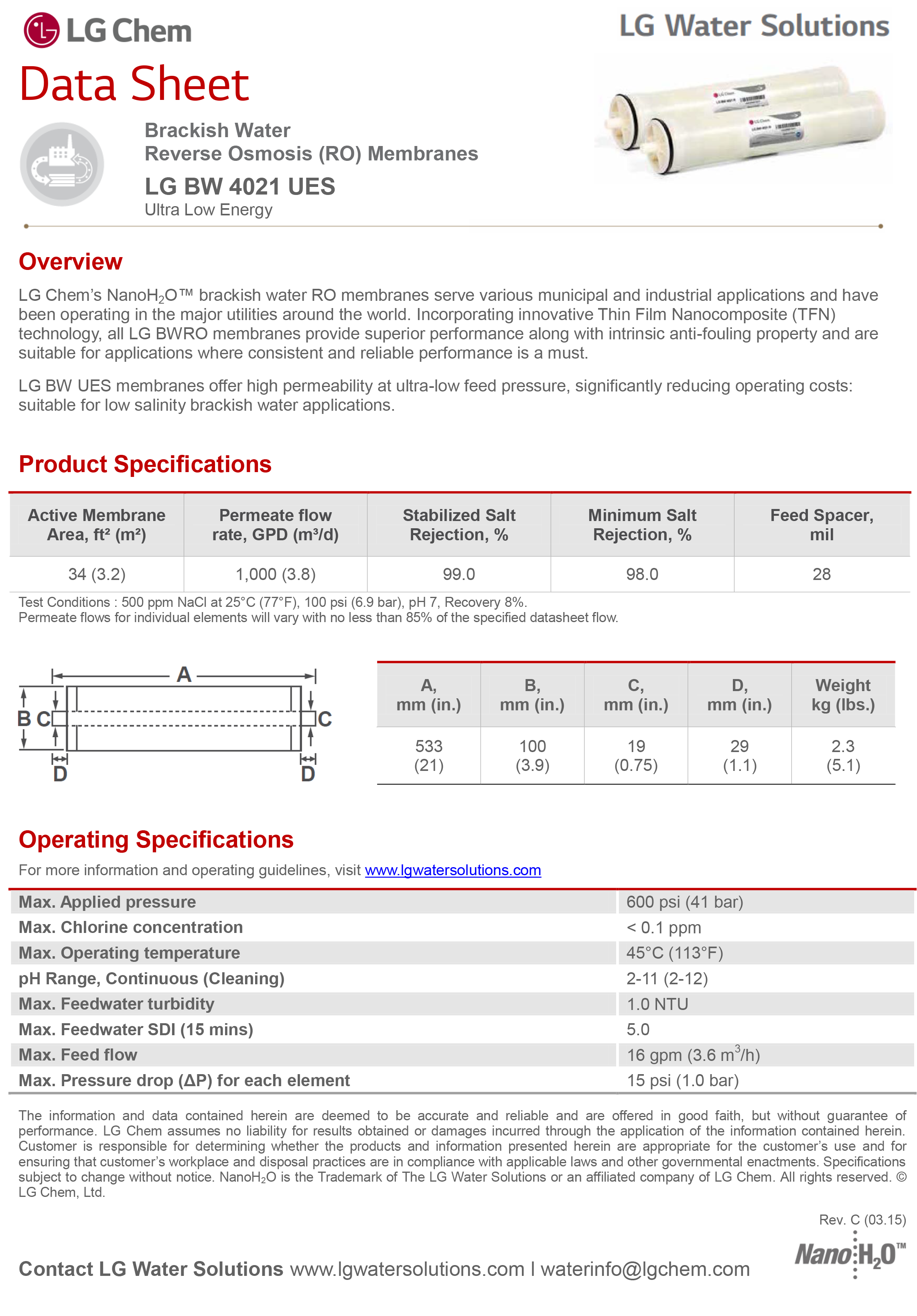 Ultra Low Energy |LG BW UES membranes offer high permeability at ultra-low feed pressure, significantly reducing operating costs: suitable for low salinity brackish water applications.