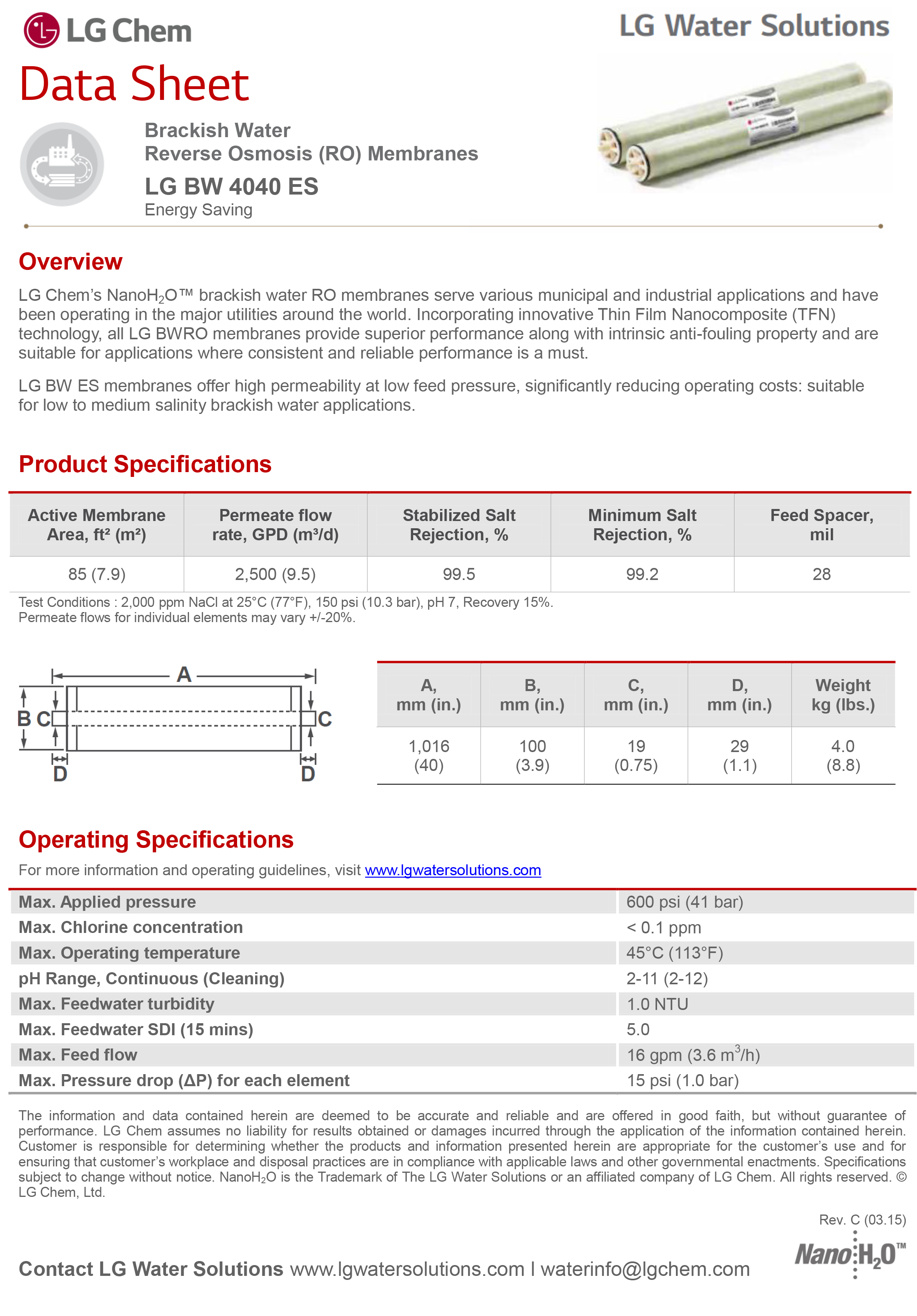 Energy Saving |LG BW ES membranes offer high permeability at low feed pressure, significantly reducing operating costs: suitable for low to medium salinity brackish water applications.