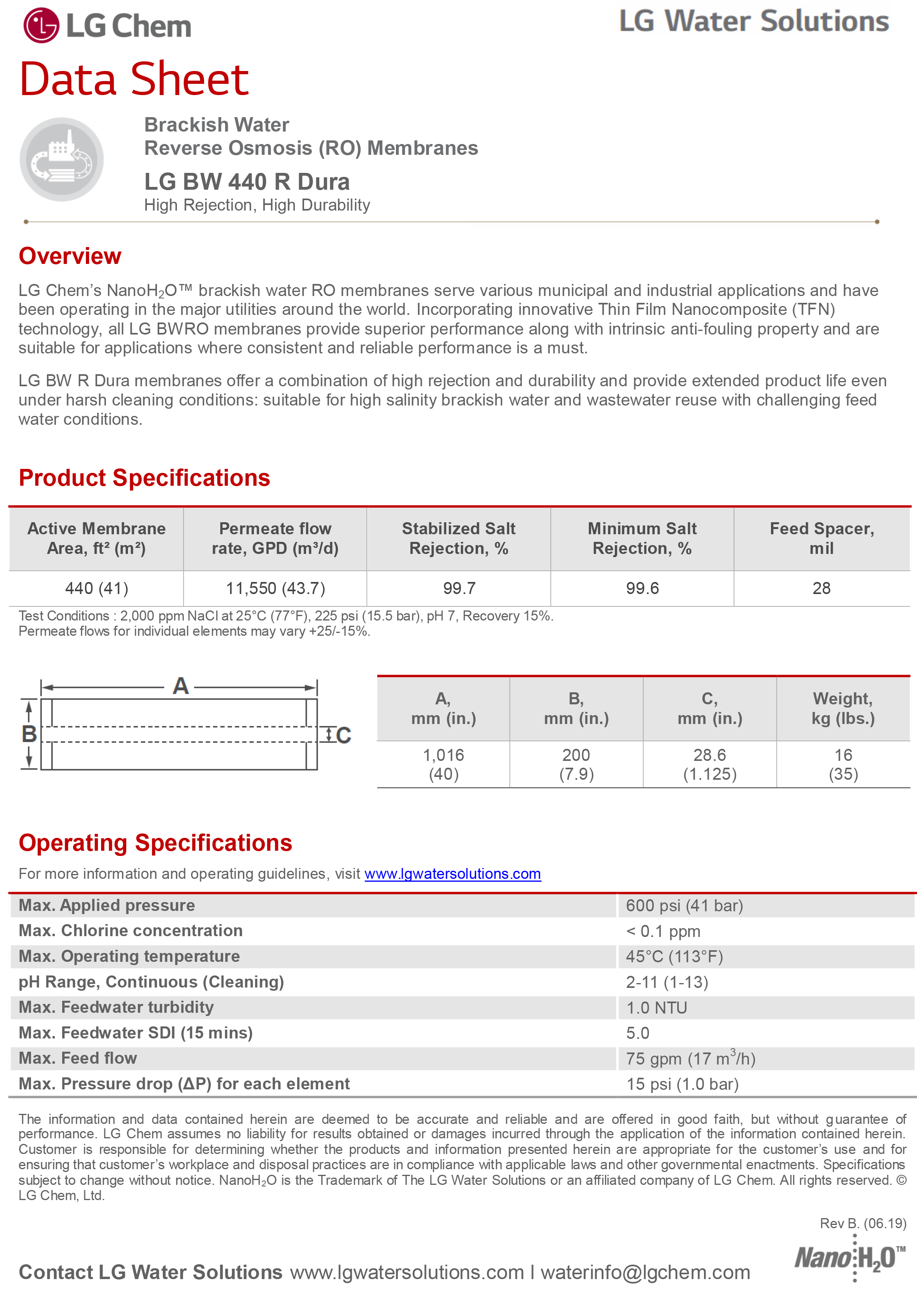 High Rejection, High Durability |LG BW R Dura membranes offer a combination of high rejection and durability and provide extended product life even under harsh cleaning conditions: suitable for high salinity brackish water and wastewater reuse with challenging feed water conditions.