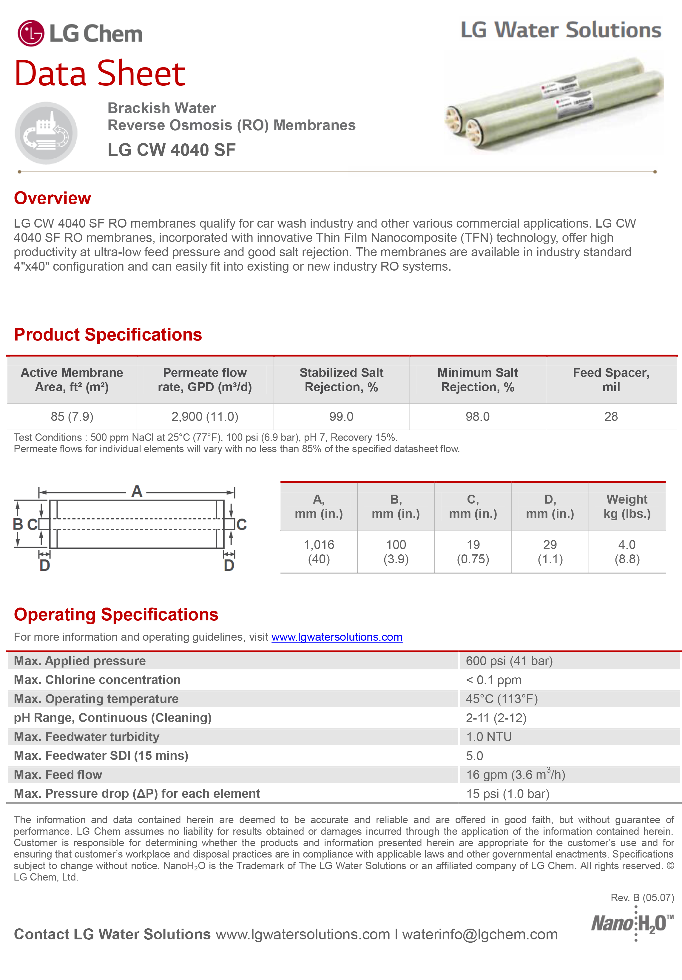 LG CW 4040 SF RO membranes qualify for car wash industry and other various commercial applications. LG CW 4040 SF RO membranes, incorporated with innovative Thin Film Nanocomposite (TFN) technology, offer high productivity at ultra-low feed pressure and good salt rejection. The membranes are available in industry standard 4"x40" configuration and can easily fit into existing or new industry RO systems.